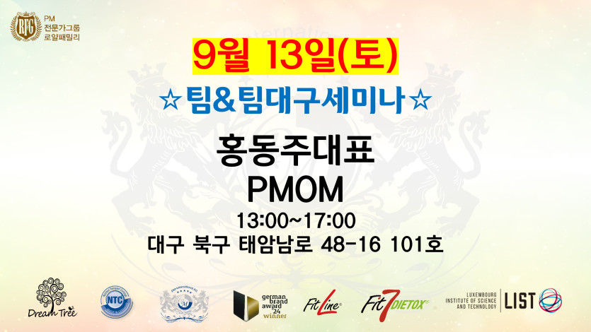팀앤팀대구세미나 페이지 정보 작성자 최고관리자 댓글 0건 조회 70회 작성일 25-09-04 08:43 목록 답변 글쓰기 본문 팀앤팀대구세미나 날짜: 9월 13일(토) 시간: 13:00~17:00 주소: 대구 북구 태암남로 48-16 101호 이전글RFG9월세미나 25.09.04 다음글팀앤팀발안세미나 25.09.04 댓글 0 댓글목록 등록된 댓글이 없습니다. 목록 답변 글쓰기